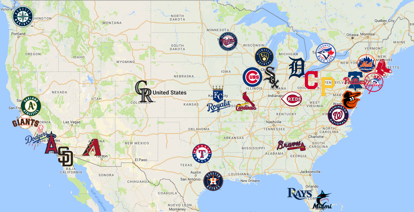 MLB Map More Baseball Maps Updated February 19 2021 Open MLB Map in Google Maps (If prompted to “Open in Google Maps”, click Cancel to open in browser) List of MLB Teams American League East Teams Baltimore OriolesBaltimore, Maryland Oriole Park at Camden Yards Shop Baltimore Orioles Boston Red SoxBoston, Massachusetts Fenway Park Shop Boston Red Sox New York YankeesNew York City, New York Yankee Stadium Shop New York Yankees Tampa Bay RaysSt. Petersburg, Florida Tropicana Field Shop Tampa Bay Rays Toronto Blue JaysToronto, Ontario Rogers Centre Shop Toronto Blue Jays American League Central Teams Chicago White SoxChicago, Illinois Guaranteed Rate Field Shop Chicago White Sox Cleveland IndiansCleveland, Ohio Progressive Field Shop Cleveland Indians Detroit TigersDetroit, Michigan Comerica Park Shop Detroit Tigers Kansas City RoyalsKansas City, Missouri Kauffman Stadium Shop Kansas City Royals Minnesota TwinsMinneapolis, Minnesota Target Field Shop Minnesota Twins American League West Teams Houston AstrosHouston, Texas Minute Maid Park Shop Houston Astros Los Angeles AngelsAnaheim, California Angel Stadium Shop Los Angeles Angels Oakland AthleticsOakland, California Oakland Coliseum Shop Oakland Athletics Seattle MarinersSeattle, Washington T-Mobile Park Shop Seattle Mariners Texas RangersArlington, Texas Globe Life Field Shop Texas Rangers National League East Teams Atlanta BravesAtlanta, Georgia Truist Park Shop Atlanta Braves Miami MarlinsMiami, Florida Marlins Park Shop Miami Marlins New York MetsNew York City, New York Citi Field Shop New York Mets Philadelphia PhilliesPhiladelphia, Pennsylvania Citizens Bank Park Shop Philadelphia Phillies Washington NationalsWashington, D.C. Nationals Park Shop Washington Nationals National League Central Teams Chicago CubsChicago, Illinois Wrigley Field Shop Chicago Cubs Cincinnati RedsCincinnati, Ohio Great American Ball Park Shop Cincinnati Reds Milwaukee BrewersMilwaukee, Wisconsin American Family Field Shop Milwaukee Brewers Pittsburgh PiratesPittsburgh, Pennsylvania PNC Park Shop Pittsburgh Pirates St. Louis CardinalsSt. Louis, Missouri Busch Stadium Shop St. Louis Cardinals National League West Teams Arizona DiamondbacksPhoenix, Arizona Chase Field Shop Arizona Diamondbacks Colorado RockiesDenver, Colorado Coors Field Shop Colorado Rockies Los Angeles DodgersLos Angeles, California Dodger Stadium Shop Los Angeles Dodgers San Diego PadresSan Diego, California Petco Park Shop San Diego Padres San Francisco GiantsSan Francisco, California Oracle Park Shop San Francisco Giants