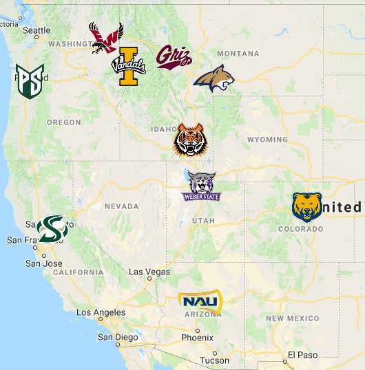 Big Sky Map More NCAA Maps Updated May 20 2024 Open Big Sky Map in Google Maps (If prompted to “Open in Google Maps”, click Cancel to open in browser) List of Big Sky Conference Teams Eastern Washington Eagles Cheney, Washington Idaho Vandals Moscow, Idaho Idaho State Bengals Pocatello, Idaho Montana Grizzlies Missoula, Montana Montana State Bobcats Bozeman, Montana Northern Arizona Lumberjacks Flagstaff, Arizona Northern Colorado Bears Greeley, Colorado Portland State Vikings Portland, Oregon Sacramento State Hornets Sacramento, California Weber State Wildcats Ogden, Utah