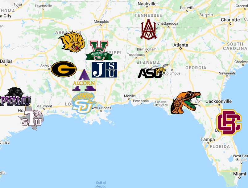 Southwestern Athletic Conference Map More NCAA Maps Updated May 24 2024 Open SWAC Map in Google Maps (If prompted to “Open in Google Maps”, click Cancel to open in browser) List of Southwestern Athletic Conference Teams Alabama A&M Bulldogs Normal, Alabama Alabama State Hornets Montgomery, Alabama Alcorn State Braves Lorman, Mississippi Arkansas Pine Bluff Golden Lions Pine Bluff, Arkansas Bethune-Cookman Wildcats Daytona Beach, Florida Florida A&M Rattlers Tallahassee, Florida Grambling State Tigers Grambling, Louisiana Jackson State Tigers Jackson, Mississippi Mississippi Valley State Delta Devils Itta Bena, Mississippi Prairie View A&M Panthers Prairie View, Texas Southern Jaguars Baton Rouge, Louisiana Texas Southern Tigers Houston, Texas